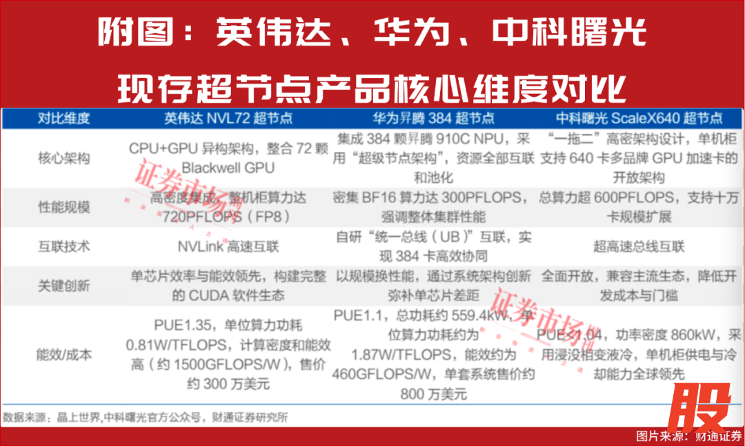 节点已成为算力厂商必争之地。财通证券表示,英伟达借助芯片、机柜、通信、软件和供应链全方位优势,持续布局推出超节点产品,国内算力厂商受制于制程劣势,选择系统化路线,不断加码超节点,意图实现“弯道追赶”。华为基于“灵衢”协议和昇腾生态实现半开放布局,中科曙光与海光信息基于全开放的 AI 计算开放架构和 CPU/GPU/存储/液冷/机柜等系统性解决方案引领行业发展。